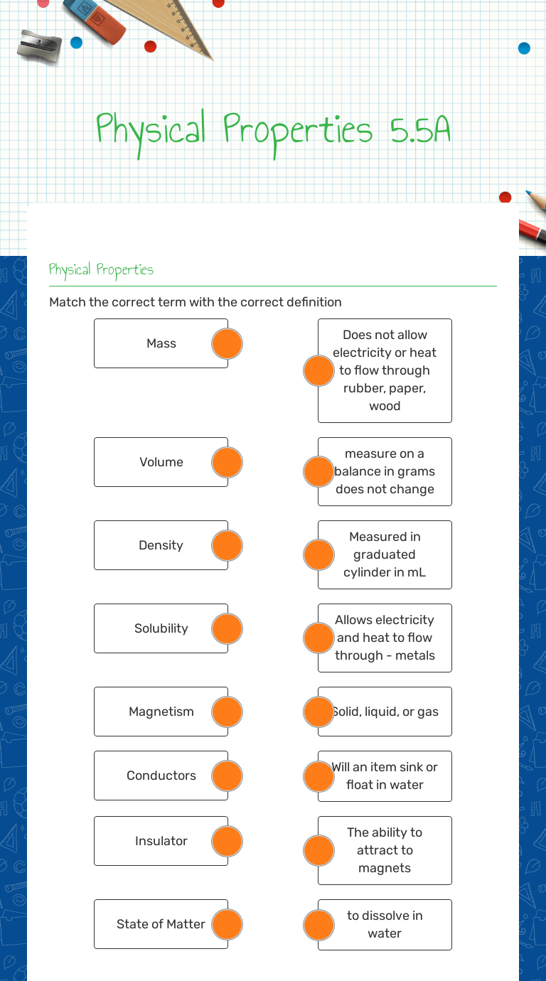Physical Properties Worksheet / Physical Properties Of Matter Worksheet Free Printable Pdf For Kids /. In this activity, students analyse and record observations on the physical properties of a number of items. For example, color, shape, mass, length, density, specific heat and odor are all examples of physical properties. A chemical property indicates how a substance . Physical and chemical properties worksheet. You can do the exercises online or download the worksheet as pdf.